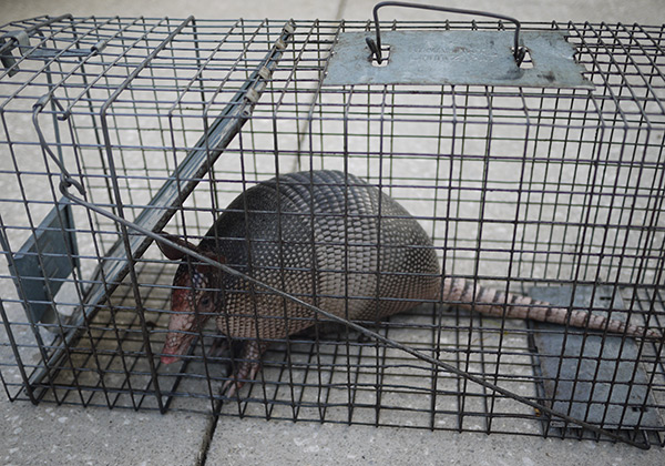 This is the most important part of the equipment, and it is important to choose a sturdy cage that is large enough for an armadillo, with those that advertise being suitable for raccoons or feral cats being about the right size. A two-door trap will work best as the trap should be placed flush against a wall, and as the armadillos prefer the cover of walking alongside the wall, they will usually head straight for the trap.